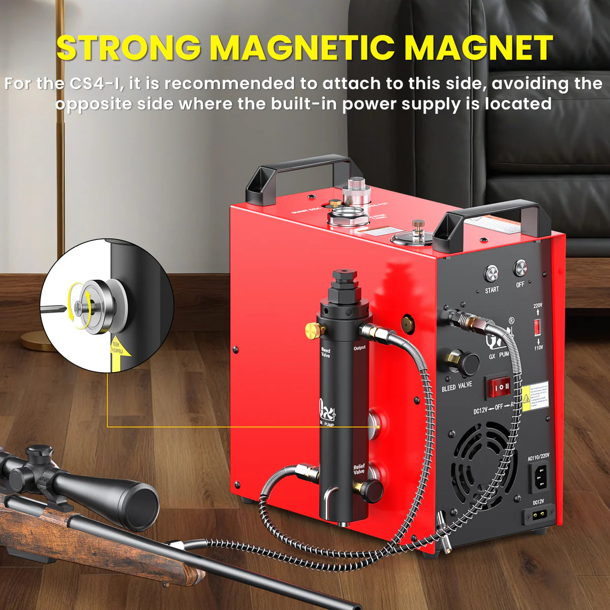 • Notice: When used with CS3-I or CS4-I models equipped with built-in converter, strong magnets may interfere with the power components. It is recommended to keep magnets clear of the built-in converter area. Refer to pictures which showing the area. For CS4-I, you can also attach to another compressor side without converter. For CS3-I, you can choose the bottom 2 magnet mounting holes.
